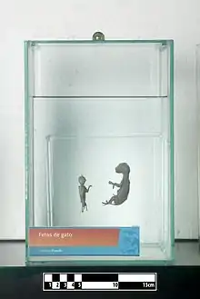 Os fetos de dois gatos. Em exposição no MAV/USP.