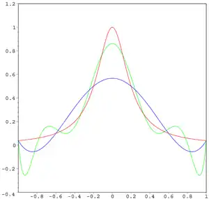 com o polinómio que tem grau , a resultante interpolação iria oscilar junto às extremidades do intervalo, ou seja, perto de -1 e 1. Pode mesmo ser provado que o erro de interpolação tende para infinito quando o grau do polinómio aumenta: