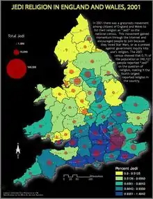 Na Inglaterra e País de Gales, 390.127 pessoas (quase 0,8%) declararam sua religião como Jedi nos formulários do Censo de 2001, superando o sikhismo, o judaísmo e o budismo, tornando-a a quarta maior religião relatada no país.[34] No censo de 2001, 2,6% da população de Brighton afirmou ser Jedi. As porcentagens de afiliações religiosas foram: