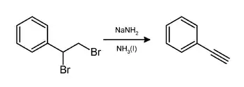 No laboratório, fenilacetileno pode ser preparado pela eliminação de brometo de hidrogênio do dibrometo de estireno usando amida de sódio em amônia:[1]