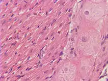 Músculos cardíaco e fibras de Purkinje tingidos com H-E.
