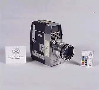 Abraham Zapruder estava em um pedestal de concreto ao longo da Elm Street, em Dealey Plaza, segurando uma câmera de alta qualidade Modelo 414 PD Bell & Howell Zoomic Director Series. Ele filmou desde o momento em que a limusine presidencial virou na Elm Street[1] para um total de 26,6 segundos, expondo 486 quadros de Kodachrome padrão de 8 mm II filme de segurança, rodando a uma média de 18,3 quadros/segundo.[3]