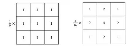 A segunda máscara da figura 14 é um pouco mais interessante, pois ela gera a chamada média ponderada, terminologia utilizada para indicar que os pixels são multiplicados por diferentes coeficientes, atribuindo dessa forma, mais importância (peso) a alguns pixels à custa dos outros, dizem Gonzalez e Woods.[1] Nesta figura, o pixel no centro da máscara é multiplicado por um valor mais alto do que qualquer outro, atribuindo, assim, mais importância a esse pixel no cálculo da média. Os outros pixels são inversamente ponderados em função de sua distância ao centro da máscara. Os termos diagonais estão mais distantes do centro do que os vizinhos ortogonais e, portanto, têm um peso menor do que os vizinhos imediatos do pixel central. A estratégia básica por trás do processo de atribuir o maior peso ao ponto central e, depois, reduzir o valor dos coeficientes em função do aumento da distância da origem, é simplesmente uma tentativa de reduzir o borramento no processo de suavização. Poderíamos ter escolhido outros pesos para atingir o mesmo objetivo geral. No entanto, a soma de todos os coeficientes da segunda máscara é igual a 16, o que é uma característica interessante para a implementação computacional por ser um número inteiro e potência de 2. Na prática, em geral é difícil ver as diferenças entre as imagens suavizadas, utilizando uma das máscaras mostradas, ou arranjos similares, porque a área coberta por essas máscaras em qualquer posição de uma imagem é muito pequena.
