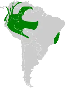 Pode ser encontrada nos seguintes países: Bolívia, Brasil, Colômbia, Equador, Guiana, Panamá, Peru e Venezuela.[1]