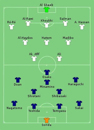 Em seguida, o Japão recuperou a posse de bola e encontrou várias oportunidades de gols antes e depois do intervalo, incluindo um cabeceio de Yoshinori Muto.[61] O Catar teve uma chance precoce de marcar seu terceiro gol aos 56 minutos em um contra-ataque, mas o chute de Hatem foi por cima do travessão.[60][61] A vantagem foi reduzida para 2–1 com um gol aos 69 minutos à queima-roupa de Takumi Minamino – o primeiro a ser sofrido pela equipe catari durante o torneio.[61][62] Aos 82 minutos, com auxílio do árbitro assistente de vídeo (VAR), foi marcado pênalti para o Catar após toque de mão de Maya Yoshida. O pênalti foi convertido pelo Akram Afif para dar ao seu grupo uma vantagem de 3–1, que manteve até o final da partida.[59][60][63]