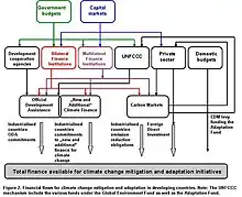 O financiamento climático é "financiamento que visa reduzir as emissões e aumentar os sumidouros de gases de efeito estufa e visa reduzir a vulnerabilidade e manter e aumentar a resiliência dos sistemas humanos e ecológicos aos impactos negativos das mudanças climáticas", conforme definido pelo Convenção-Quadro das Nações Unidas sobre a Mudança do Clima (CQNUMC).[1] O termo tem sido usado em sentido estrito para se referir a transferências de recursos públicos de países desenvolvidos para países em desenvolvimento, à luz de suas obrigações da Convenção do Clima da ONU de fornecer "recursos financeiros novos e adicionais", e em um sentido mais amplo para se referir a todos os fluxos relacionados à mitigação e adaptação às mudanças climáticas.[2][3]