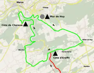 O percurso teve algumas mudanças com relação à edição anterior, como importante novidade a linha de saída regressa à cidade de Ans situado na Valônia da Bélgica, desde ali o pelotão pôs rumo para às cumes da Côte de Tancrémont e a Côte des Forges para, acto seguido, abandonar as estradas da província de Liège na Bélgica e ingressar a estradas do país do Luxemburgo por uns quantos quilómetros. Mais adiante, de novo na Bélgica, os contínuos montes seguirão minando a moral e as forças dos corredores até chegar ao primeiro passo pelo tríptico da Côte d’Ereffe, Côte de Cherave, e o Muro de Huy, e enfrentar as três voltas ao circuito final de 29 quilómetros e finalizar no tradicional Muro de Huy.[1][2]