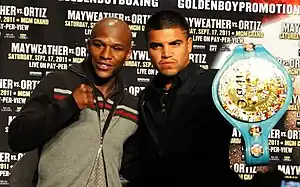 Em 18 de setembro de 2011 o atleta teve a vitória mais polêmica de sua carreira. No quarto round, Ortiz atingiu Mayweather com uma cabeçada. O juiz separou os dois lutadores, e com o adversário ainda com a guarda baixa, Mayweather acertou uma combinação para derrubar Ortiz, que foi nocauteado quando faltavam 2 minutos e 59 segundos para o encerramento do round. Pela única vez, Floyd foi vaiado em sua carreira.[20]