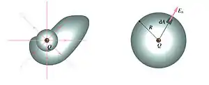 O fluxo através de uma superfície fechada à volta de uma carga pontual Q, é igual ao fluxo numa esfera com centro na carga, já que todas as linhas de campo que passam através da superfície passam também através da esfera. Nessa esfera, com raio R, o campo é perpendicular e com módulo constante, , em toda a superfície.[2]