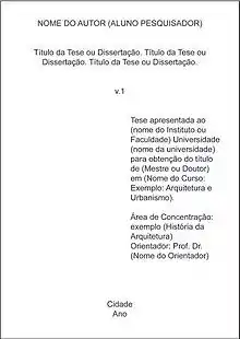 A folha de rosto em teses e dissertações é obrigatória e deve apresentar os elementos essenciais à identificação do trabalho.[5] Ver exemplo gráfico no fim deste artigo. A folha de rosto deve conter:[5]