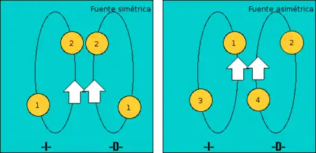 Uma fonte pode ser síncrona ou assíncrona. Em uma fonte síncrona, ambas as mãos lançam ao mesmo tempo, enquanto em uma fonte assíncrona, as mãos alternam os lançamentos. "O padrão da fonte (...) pode ser realizado de forma estável de duas maneiras (...) pode-se executar a fonte com frequências diferentes para as duas mãos, mas essa coordenação é difícil por causa da tendência dos membros de sincronizar."[2]