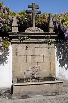 Com a forma de chafariz espaldar, é construída em granito, e dela faz parte também um pequeno tanque. A água brota da boca de uma carranca talhada na pedra, sendo recebida no tanque e vertendo a água para o interior da quinta. A encimar a fonte, estão duas peças graníticas piramidais (uma de cada lado) e no centro uma cruz Primacial. Gravado na pedra no centro da fonte, está a data da sua construção - 1636.
