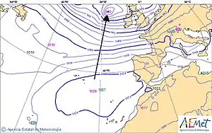 O vetor gradiente de pressão naturalmente aponta para onde a taxa de variação é a maior. Sendo assim, o vento flui na mesma direção do vetor, que é perpendicular às curvas de nível (isóbaras) da pressão atmosférica. Entretanto, outras forças desviam o fluxo de ar da direção do vetor de gradiente de pressão, como as forças inerciais de Coriolis e centrífuga. A força de Coriolis é o pelo movimento rotacional de ciclones e anticiclones, por exemplo.[1]