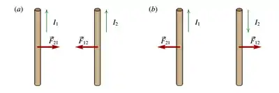 Calculando o sentido do campo produzido por cada condutor, e o sentido da força que esse campo exerce sobre o segundo condutor, conclui-se que a força entre dois fios com correntes no mesmo sentido é atrativa, e a força entre dois fios com correntes em sentidos opostos é repulsiva.[1]
