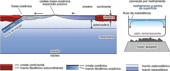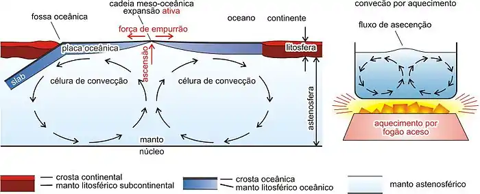 A teoria de tectônica de placas surgiu em 1968 como uma evolução do modelo de expansão do fundo do oceano. Essas teorias foram originadas do modelo de deriva continental. Durante a década de 1960, sob forte influência do modelo de expansão do fundo do oceano, a força motriz fundamental para movimento das placas foi atribuída à convecção térmica do manto. Isto é, as placas se movimentam horizontalmente sendo arrastadas pela convecção do manto astenosférico, que está presente abaixo da litosfera. A força direta para o movimento das placas era interpretada como a empurrão ativa da cadeia meso-oceânica, denominada “ridge-push”. Naquela época, todas as partes do manto abaixo da litosfera eram interpretadas como a astenosfera, com a espessura de 2800 km. Para explicar esta ideia, foi utilizada a comparação com a água na panela sobre um fogão aceso. Atualmente, este modelo está amplamente divulgado em nível de educação geológica.