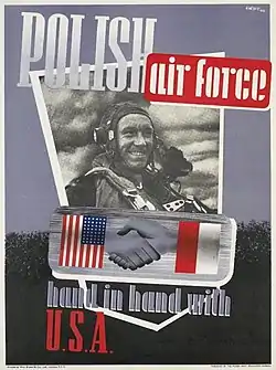 A Força Aérea Polonesa também lutou em 1943 na Tunísia (o Polish Fighting Team, conhecido como "Skalski's Circus") e em ataques à Alemanha (1940–45). [42] [43] Na segunda metade de 1941 e início de 1942, os esquadrões de bombardeiros poloneses eram a sexta parte das forças à disposição do Comando de Bombardeiros da RAF (posteriormente sofreram pesadas perdas, com poucas possibilidades de reabastecimento). As perdas de tripulações polonesas servindo no Comando de Bombardeiros 1940-45 foram de 929 mortos; as perdas totais da tripulação polonesa foram de 1.803 mortos. [42] No final das contas, oito esquadrões de caça poloneses foram formados dentro da RAF e reivindicaram 621 aeronaves do Eixo destruídas em maio de 1945. [44] No final da guerra, cerca de 19.400 poloneses serviam na RAF. [45]