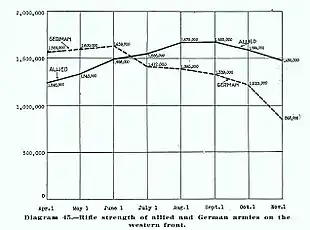 | Efetivo | ~ 4 milhões de homens, metade dos quais estavam na França no período do armistício (1919) |