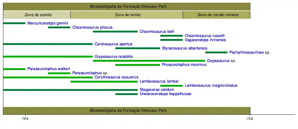 A Formação Dinosaur Park pode ser dividida em pelo menos duas faunas distintas. A parte inferior da formação é caracterizada pela abundância de Corythosaurus e Centrosaurus. Este grupo de espécies é substituído mais alto na formação por uma fauna ornitísquia diferente, caracterizada pela presença de Lambeosaurus e Styracosaurus.[5] O aparecimento de várias espécies novas e raras de ornitísquios no topo da formação pode indicar que uma terceira fauna distinta substituiu a segunda durante a transição para sedimentos mais jovens, não pertencentes ao Parque dos Dinossauros, ao mesmo tempo em que um mar interior transgride para a terra , mas há menos restos aqui. Um paquirrinossauro sem nome, Vagaceratops irvinensis e Lambeosaurus magnicristatus podem ser mais comuns nesta terceira fauna.[6][7]
