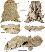Um parietal, fragmentos escamosos, fusão jugal\epijugal e outros fragmentos cranianos não identificados.[24] | Um ceratopsídeo chasmossaurino que foi hipotetizado para formar uma série anagenética com várias outras espécies de chasmossauros, incluindo Terminocavus.[24] | ||