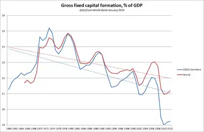 - Em terceiro lugar, a formação bruta de capital é frequentemente usada como sinônimo de formação bruta de capital fixo, mas estritamente falando, isso é um erro porque a formação bruta de capital se refere a mais ganhos de ativos líquidos do que apenas capital fixo (também inclui ganhos líquidos em níveis de estoque e o saldo de fundos emprestados no exterior).