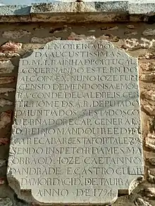 EM O REINADO DA AUGUSTISSIMA S. D. M. I. RAINHADPORTUGALGOUERNANDO ESTE RN. DO ALG.OILMO.E EXMO. NUNO IOZE FULGENSIO DEMENDONSA EMOURA CONDE DE UALEDREIS GENTILHOME DS.A.R. DEPUTADO DA JUNTA DOS 3 ESTADOS GOUERNADOR E CAP. GENERAL DTO. REINO MANDOU REEDIFICAR ECABAR ESTAFORTALEZA SENDO INSPETOR DA MESMA OBRA O DR. JOZE CAETANNO DANRADE E CASTRO GUARDA MOR DA CID. DE TAUIRA ANNO DE 1794.