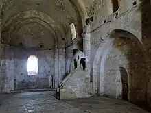 A atual capela provavelmente foi construída para substituir a destruída por um terremoto em 1170.[18] Somente a extremidade leste da capela original, que abrigava a abside, e uma pequena parte da parede sul sobrevivem.[32] A capela posterior tinha uma abóbada de berço e uma abside descomplicada; seu desenho teria sido considerado fora de moda pelos padrões contemporâneos na França, mas tem semelhanças com o que foi construído por volta de 1186 em Margate.[18] Foi dividido em três vãos aproximadamente iguais. Uma cornija flui ao redor da capela no ponto em que a abóbada termina e a parede começa. Orientada aproximadamente de leste a oeste, tinha 21,5 metros de comprimento e 8,5 metros de largura, com a entrada principal a oeste e a segunda menor na parede norte. Ao ser remodelada no início do século XIII, a entrada foi transferida à parede sul. A capela era iluminada por janelas acima da cornija, uma na extremidade oeste, uma de cada lado do vão leste e outra no lado sul do vão central, e a abside no extremo leste tinha grande janela. Em 1935, uma segunda capela foi descoberta do lado de fora da entrada principal, no entanto, não sobrevive mais.[53]