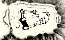 Entre 1142 e 1170, os hospitalários realizaram um programa de construção no local. Foi defendida por uma parede de cortina de pedra cravejada com torres quadradas que se projetavam ligeiramente. A entrada principal ficava entre duas torres no lado leste e havia um portão traseiro na torre noroeste. No centro havia uma ala cercada por câmaras abobadadas. A configuração do solo ditava sua forma irregular. Um local com defesas naturais era um local típico para castelos cruzados e as encostas íngremes forneceram à Fortaleza dos Cavaleiros defesas por todos os lados, onde suas defesas estavam concentradas. Esta fase do edifício foi incorporada na construção posterior.[18]