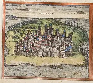 Ao contrário de Melinde, Mombaça hostilizou a presença da frota de Vasco da Gama em 1498, vindo a ser atacada em 1505, em represália, por D. Francisco de Almeida, primeiro Vice-rei do Estado Português da Índia. Nos anos seguintes, por diversas ocasiões foi alvo de ataques portugueses, o último dos quais conduzido por D. Nuno da Cunha, em 1528. Este, a caminho de Goa onde viria a tomar posse como Governador-geral do Oriente, decidiu pela destruição da cidade, arrasada na ocasião.