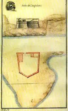 - "1º - Forte da Laginha. Este forte carece a porta concertada e as suas muralhas precisam ser encascadas e rebuçadas e da parte do nascente precisa ser mociçada a sapata e guarnecida de cantaria. O seu quartel precisa a porta e a tarimba concertada. Tem quatro peças de ferro boas e os reparos de duas precisam ser concertados. Precisa para se guarnecer quatro artilheiros e dezeseis auxiliares."[2]