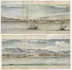 Porto de Bandar Abbas, Pérsia (aquarela neerlandesa, 1704).