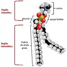 Fosfatidilcolina é um fosfolipídio natural de massa igual à 780g/mol. Ele possui polaridade, visto que possui, por um lado, duas cadeias hidrocarbônicas longas, sendo uma saturada e outra insaturada, redundando em sua porção hidrofóbica, apolar. E de outra parte, um colesterol, um grupo fosfato e uma colina formam sua porção hidrofílica, polar.