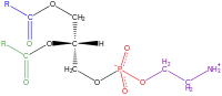 Considerando que o grupo fosfato é combinado com colina em fosfatidilcolina, e combinado com a etanolamina em fosfatidiletanolamina. Os dois ácidos gordurosos podem ser iguais ou diferentes, e geralmente estão nas 1,2 posições (embora possam estar nas 1,3 posições).