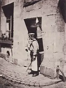 Em 1838 ou 1839, a primeira fotografia de figuras na rua foi registrada por Louis-Jacques-Mandé Daguerre em uma de duas vistas de daguerreótipos tiradas da janela de seu estúdio no Boulevard du Temple em Paris. A segunda, feita no auge do dia, mostra um trecho de rua vazio, enquanto a outra foi tirada por volta das 8h, e como relata Beaumont Newhall, "O Boulevard, tão frequentemente preenchido com uma multidão de pedestres em movimento e carruagens, estava perfeitamente solitário, exceto por um indivíduo que estava tendo suas botas engraxadas. Seus pés foram obrigados, é claro, a ficar parados por algum tempo, estando um na caixa da bota preta e o outro no chão. Consequentemente, suas botas e pernas eram bem definidas, mas ele estava sem corpo e sem cabeça, porque estas estavam em movimento."[6]