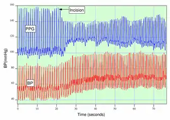 Durante um procedimento cirurgico, onde o paciente necessita de anestesia, os anestesiologistas frequentemente devem julgar subjetivamente se a anestesia aplicada é suficiente. Como visto na figura, se um paciente não está suficientemente anestesiado, a resposta do sistema nervoso simpático a uma incisão pode gerar uma resposta imediata na amplitude do PPG. [9]