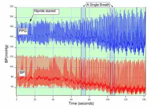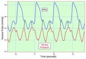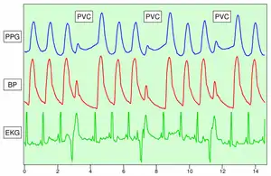 A amplitude da componente AC é proporcional à pressão de pulso. Como visto na figura o pulso de PPG para o ciclo cardíaco com o PVC resulta em menor pressão arterial de amplitude e um PPG. Taquicardia ventricular e fibrilação ventricular também podem ser detectadas. [8]