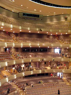 O auditório é modelado no estilo europeu de casas de ópera, com cinco andares e o auditório em forma de ferradura.