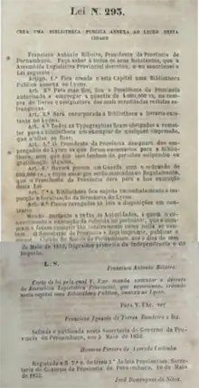 Lei sancionada pelo mesmo, em 1852, criando a Biblioteca Estadual de Pernambuco.