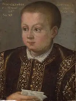O imperador Carlos V, concede-lhe a investidura como monarca dos referidos territórios em 28 de junho de 1543, encontrando-se com o pequeno Francisco e sua mãe no castelo de Medole, na presença de Ferrante Gonzaga, governador de Milão, e do cardeal Hércules Gonzaga. Na mesma ocasião, foram acordadas as núpcias do pequeno duque com a sobrinha do imperador, Catarina de Áustria, filha de Fernando de Habsburgo.