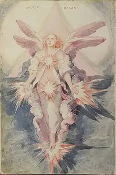 Assim também se influenciou pela obra Da Hierarquia Celeste de Pseudo-Dionísio, o Areopagita, dizendo que o artista, desde que se mantenha em pureza qual um sacerdote, tem um privilégio de expressar na arte com formas manifestas as imagens daqueles que são invisíveis, como os anjos ou o próprio Deus. Surgem, assim, representações espiritualizadas, animadas, com aparências oníricas e flutuantes e grande quantidade de abstrações, principalmente no De Aetatibus Mundi Imagines (Livro das Idades).[1][3] "Como Deus foi pintor, com lux e dia, cor perfeitíssima, matizou elle as imagens encarecidas dos angélicos tronos e serafins".[4]