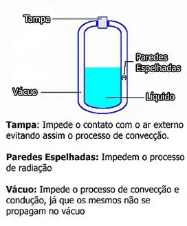 Para o recipiente ser eficiente ele deve anular o máximo possível as trocas de calor, essas trocas ocorrem pela condução, convecção e radiação.