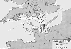 ![]() Da esquerda para a direita, de cima para baixo: Centro de Roterdã destruído após uma blitz alemã, bombardeiros Heinkel He 111 durante a Batalha da Inglaterra, tropas americanas desembarcando na Praia de Omaha durante a Operação Overlord, paraquedistas aliados saltando nos Países Baixos durante a Operação Market Garden, tropas americanas durante o Cerco de Bastogne, blindados e infantaria americanos avançando sobre Wernberg. | |||