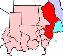 Estados de Kassala, Gadarife e Mar Vermelho (em vermelho), todos os quais na fronteira com a Eritreia (em azul claro). O Mar Vermelho está marcado em cinza