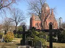 Cemitério com a Heilig-Kreuz-Kirche na Zossener Straße