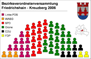 | Parlamento do distrito (BVV): | Aliança 90/Os Verdes 20, SPD 15, A Esquerda 10, CDU 5, WASG 3, FDP 2 (última eleição em 2006) | |
