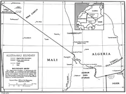 ![]() Acima: Localização do Mali (laranja) e da Argélia (verde). Abaixo: Mapa da fronteira Argélia-Mali. | |