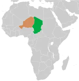 ![]() Acima: Localização do Níger (laranja) e Chade (verde). Abaixo: Mapa das fronteiras dos dois países. | |