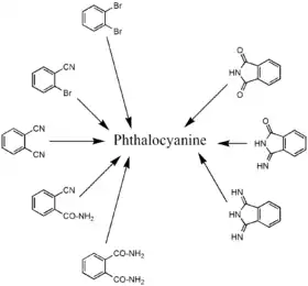 Ftalocianina forma-se pelo aquecimento de derivados de ácido ftálico que contenham grupos funcionais nitrogenados. Precursores clássicos são ftalonitrila e diiminoisoindol. Na presença de ureia, o aquecimento de anidrido ftálico é uma rota útil para H2Pc. Estas reações são mais eficientes na presença de sais metálicos. Outros precursores incluem o-cianobenzamida e ftalimida. Vários destes materiais de partida são mostrados na figura abaixo (lado direito). Utilizando estes métodos, produziram-se aproximadamente 57 mil toneladas de ftalocianinas em 1985.[12]