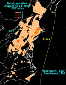 O furacão exigiu precauções padrão nas Bahamas e na Flórida, embora não tenha afetado a região. Na Carolina do Norte, ventos e ondas atingiram a costa, enquanto em torno de Nova Iorque, chuvas fortes causaram algumas inundações. Ao longo de Cabo Cod e Nantucket, a Able produziu ventos de até 89 km/h (55 mph) e ondas altas, e em toda a Nova Inglaterra houve nove mortes no trânsito. O furacão matou 2 pessoas no Canadá e causaram mais de $ 1 milhão em danos.