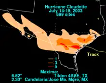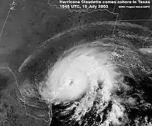 Furacão Claudette pouco depois de atingir terra no Texas em 15 de julho | |
