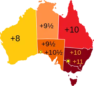 A Austrália usa três principais fusos horários: Horário Padrão da Austrália Ocidental (AWST; UTC + 08: 00), Horário Central Australiano (ACST; UTC + 09: 30) e Horário Padrão da Austrália Oriental (AEST; UTC + 10: 00).[1] O horário é regulado pelos governos estaduais individualmente, alguns dos quais usam o horário de verão. (DST) Os territórios externos da Austrália têm diferentes fusos horários.[2]